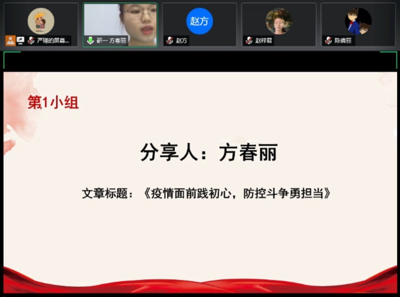 会议的第二部分是进行以“疫情面前践初心,防控斗争勇担当”为主题的优秀心得分享交流。学员们结合《习近平的七年知青岁月》读后感和讨论主题进行了充分交流。第一小组的发言人方春丽分享了她的文章,她提到,在疫情期间各行各业的年轻人以自己的青春热血书写了一个个感人的故事,在疫情阻击战中没有一个人是旁观者,越是关键时刻越能突显出一个人的使命与担当;第二小组发言人金卓在她的文章中概括了习近平总书记在梁家河的故事,表示要坚持学习优秀共产党员艰苦奋斗、砥砺前行、爱国为民的精神;第四小组发言人孙园将习近平总书记的七年知青岁月与疫情期间的青年医护人员奋战疫情第一线的表现联系起来,表示他们虽身处不同时代,但却展示了同样的不畏牺牲、不怕艰难、敢于奋斗拼搏的青年风貌。
