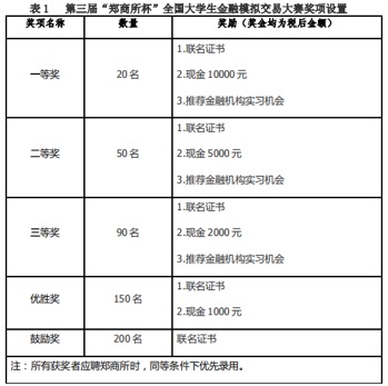 一等奖、二等奖、三等奖的获奖者可获得:(1)郑商所、金融教指委、中期协联合颁发的证书;(2)现金奖励;(3)推荐郑商所、中期协以及其他金融机构实习机会。其中,一等奖奖励税后10000 元,二等奖奖励税后5000 元,三等奖奖励税后2000 元。