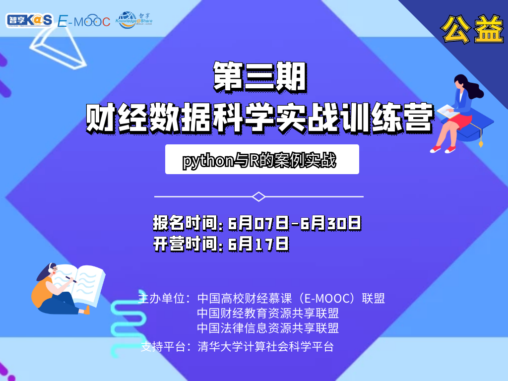 大数据的普及和数据科学的平民化为高校师生带来了全新的机遇,为满足高校师生对数据科学技术的学习需求,由中国高校财经慕课(E-MOOC)联盟、中国财经教育资源共享联盟、中国法律信息资源共享联盟、北京百智享科技有限公司、清华大学计算社会科学平台联合推出财经数据科学实战训练营活动。第三期“财经数据科学实战训练营”适合财经学子的数据科学课程以python及R语言为核心,邀请了南京大学、上海财经大学、华东理工大学等高校知名教师线上直播授课。