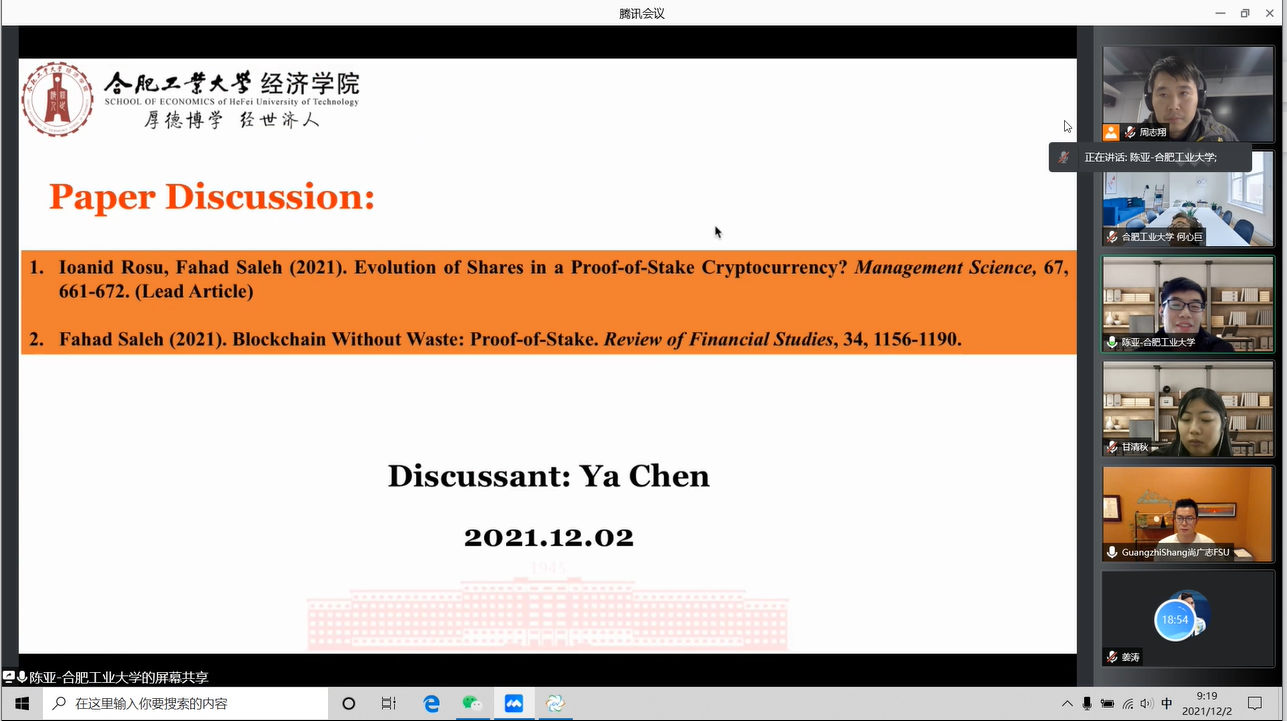 本次网络研讨会的第一项内容是由陈亚老师带来的两篇文献汇报。第一篇文献的题目为“ Evolution of Shares in a Proof-of-Stake Cryptocurrency”。陈老师首先介绍了虚拟货币的相关背景以及本文的研究动机,接着详细介绍了本文的研究设计,包括投资者份额、股权证明协议、交易策略与议价等。最后得出结论:具有买入和持有策略的投资者的份额根据鞅的变化而变化。当所有投资者都买入并持有时,奖励时间表保持不变(正常化为一个),投资者股票共同接近已知的分配,称为Dirichlet分配。由于交易成本极低,所有投资者都宁愿