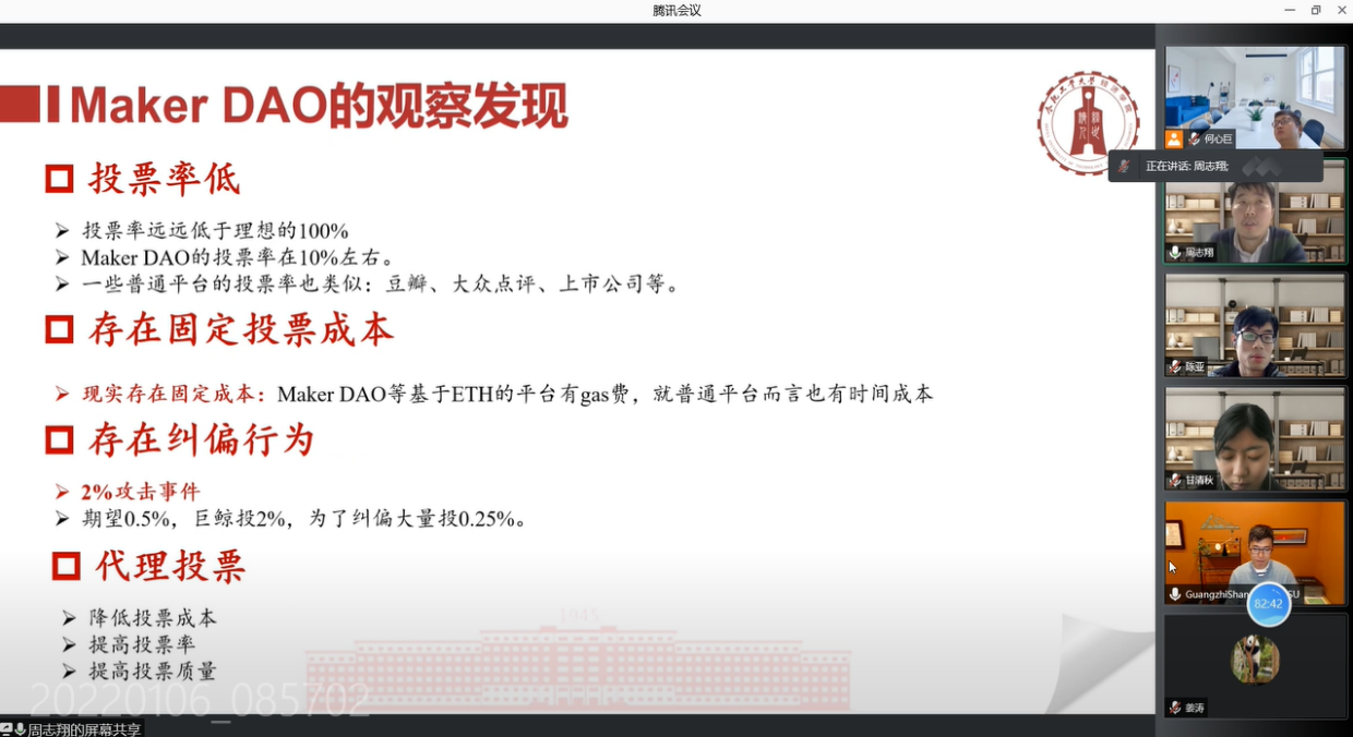 区块链系列网络研讨会共10场,汇报相关前沿文献共18篇,进行主题汇报10次,涉及Bitcoin、Ethereum、NFT、DAO、ICO等多个区块链相关领域或平台。研讨会由304am永利集团官网学术交流中心主任何心巨主持,学院教师周志翔、陈亚参与研讨,美国佛罗里达州立大学商学院副教授尚广志应邀作为点评嘉宾,学院研究生积极参与,学术研讨氛围热烈浓厚。