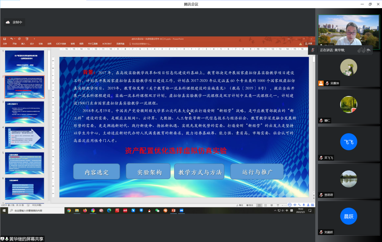 会上,黄华继教授以2019年国家级虚仿项目《资产配置优化选择虚拟仿真实验》为例,深入解读了国家虚拟仿真实验教学项目建设的工作背景和相关要求。主要包括示范性虚拟仿真实验教学项目建设规划与政策解读,虚仿项目内容的选定、实验架构的搭建,信息技术与实验教学项目的融合与发展,实验教学的方式与方法,国家级虚仿实验教学项目申报的要求及注意要点等。与会老师围绕“国家级虚仿实验项目建设”主题,结合自身在项目研究申报中的实际情况,对现阶段及后续工作开展中需要注意的事项与黄教授进行了热烈的讨论与交流。