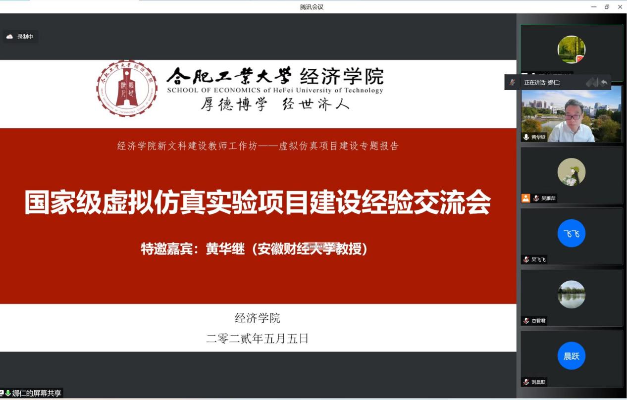 为深入推进虚拟仿真实验教学项目的开展,加强高等教育实验教学优质资源的建设和应用,5月5日晚,304am永利集团官网召开了新文科建设教师工作坊第六讲——国家级虚拟仿真实验项目建设经验交流报告会。会议特邀安徽财经大学经济学类跨专业综合实验教学中心主任黄华继教授做交流指导。各系参与虚仿项目研发的老师,实验中心人员共同参会,会议由实验中心主任娜仁主持。