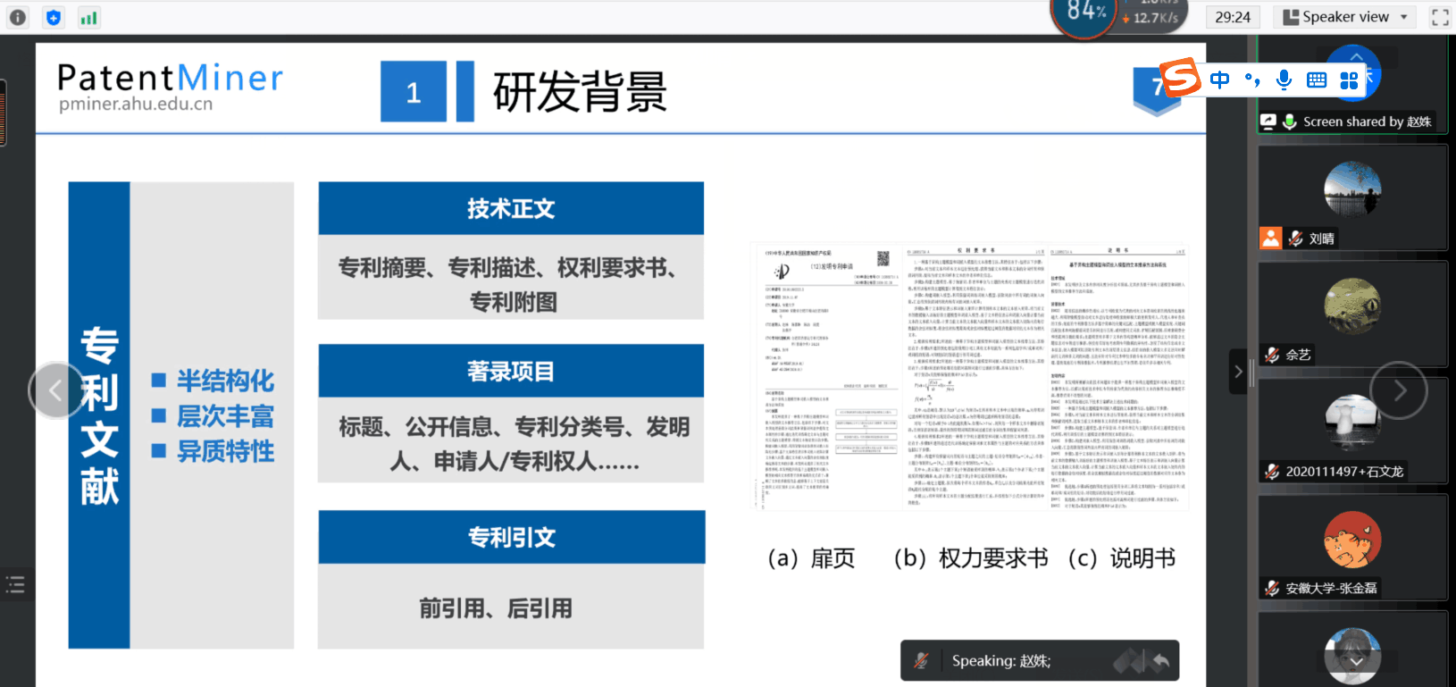 20221117日,安徽大学计算机科学与技术学院赵姝教授应邀与永利官网师生开展线上学术交流活动赵姝教授首先通过腾讯会议为学院师生做了主题为“面向专利数据的表示学习方法研究”的学术报告报告由刘晴教授主持,学院40名师生参。赵姝教授详细介绍了表示学习方法的研究进展,阐述如何通过将专利数据转化为低维稠密的向量进而实现多个下游任务的过程,从专利文本、发明人、申请人、多层次标签等方面介绍专利研究方法,并展示了团队研发的专利智能服务平台PatentMiner随后,赵姝教授就文献阅读、机器学习算法、文本分析方法应用等议题与在场师生进行了充分的沟通与交流,耐心解答了师生的相关问题。
