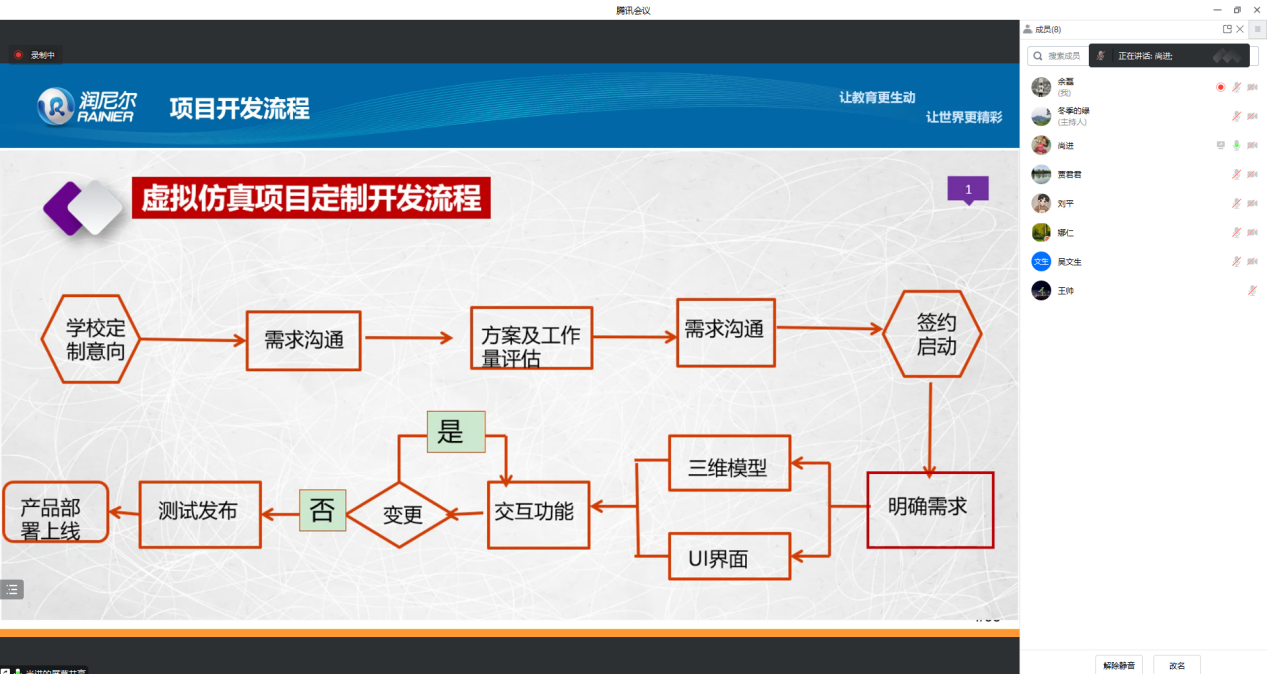 会上,润尼尔网络科技有限公司人员刘平对项目的整体开发流程作了系统性阐述,对每一时间节点的具体任务内容作了简要梳理,并对此次项目建设开发团队、对接人员作了基本介绍。随后,贾君君副教授作为永利官网项目开发团队负责人,对项目脚本及主要内容设想作了详细汇报。最后,双方就高标准虚拟仿真教学项目的特点、要求等进行了信息交流,并对项目的框架、文本大数据资源、虚拟仿真的实验效果以及在建设过程中可能出现的问题展开了沟通。