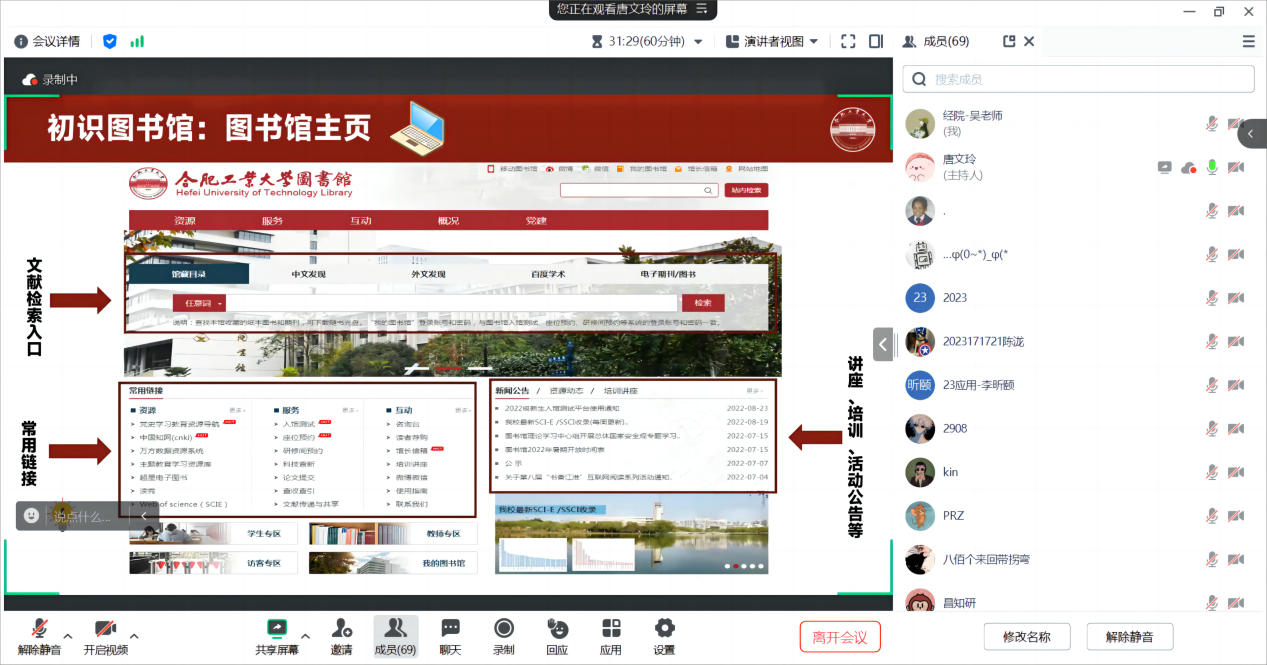 本次新生入馆教育的主要内容包括图书馆概况、资源分布、信息资源检索介绍、电子资源访问途径、图书馆特色主题活动等方面内容,旨在从多个维度和角度介绍图书馆的资源与服务。唐老师详细讲解了我校图书馆的空间分布、自助设施、馆藏资源等,使同学们了解到图书馆的书目分类以及图书检索等专业知识。