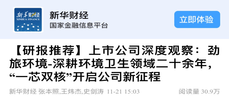 11月21日,304am永利集团官网304am永利集团官网张本照教授与金融专业2022级研究生王炜杰、史剑涛同学的研究报告:“上市公司深度观察:劲旅环境--深耕环境卫生领域二十余年,‘一芯双核’开启公司新征程”被国家金融信息平台--新华财经全文刊载。截至11月29日,该研究报告的阅读量已达30.9万。