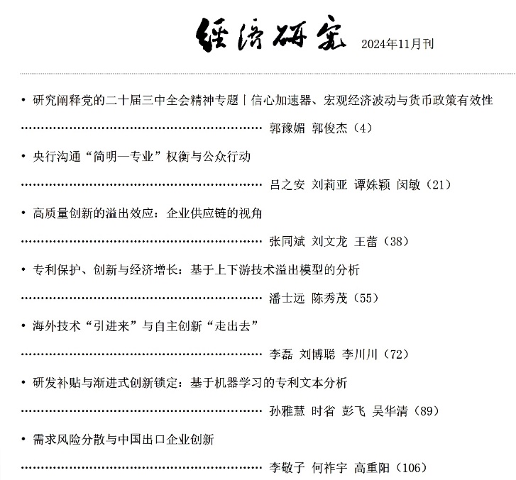 近日,永利官网孙雅慧老师为第一作者的论文《研发补贴与渐进式创新锁定:基于机器学习的专利文本分析》在《经济研究》2024年第11期发表(通讯作者:时省;合作者:彭飞、吴华清)。本论文得到国家社会科学基金重大项目(18ZDA064)、国家自然科学基金青年项目(72004052)、国家自然科学基金面上项目(72273038)、教育部人文社会科学研究青年基金项目(24YJC790156)和安徽省自然科学基金青年项目(2408085QG219)的资助。《经济研究》由中国社会科学院经济研究所主办,是综合性经济理论类权威期刊,致力于发表关于中国特色社会主义经济建设事业中重大现实问题的高水平理论研究类文章,2023年的复合影响因子为20.288